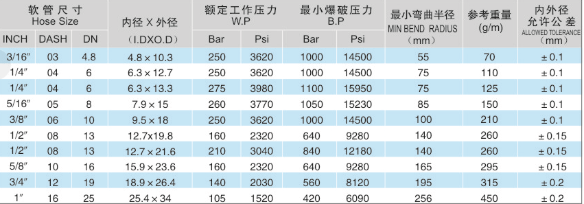 两层纤维编织树脂管部分规格参数: